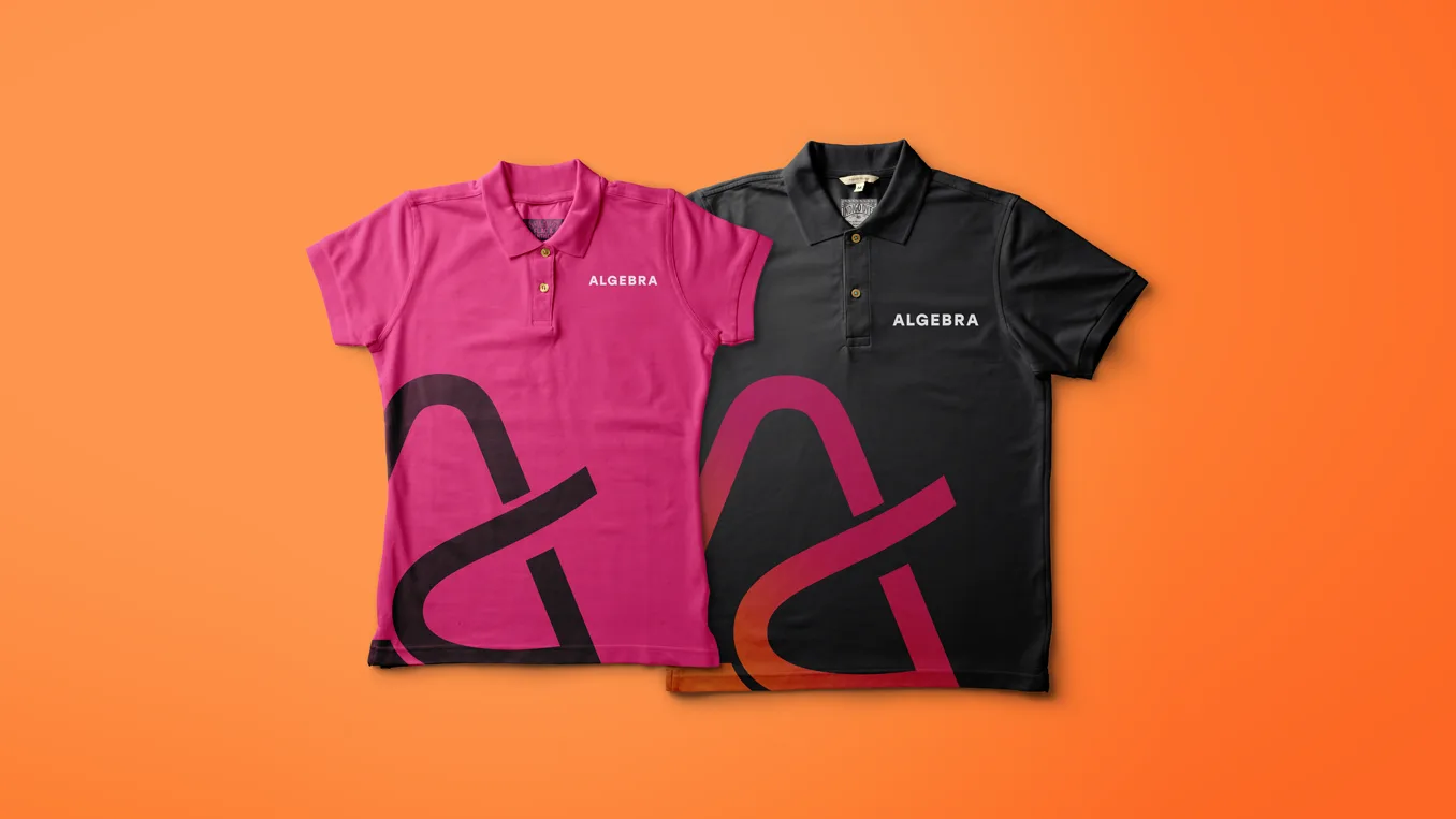 Na temelju brand strategije Studio Sudar je kreirao novi vizualni identitet Algebre. Logotip predstavlja stilizirano slovo A koje podsjeća na otvorenu stranicu knjige, te time simbolizira učenje, kontinuirani rast i napredak, a zbog svojih boja energičnost, strast i iskru. Novi vizualni identitet kreativno je apliciran na niz aplikacija i u interijer kampusa čime je oživio brand.