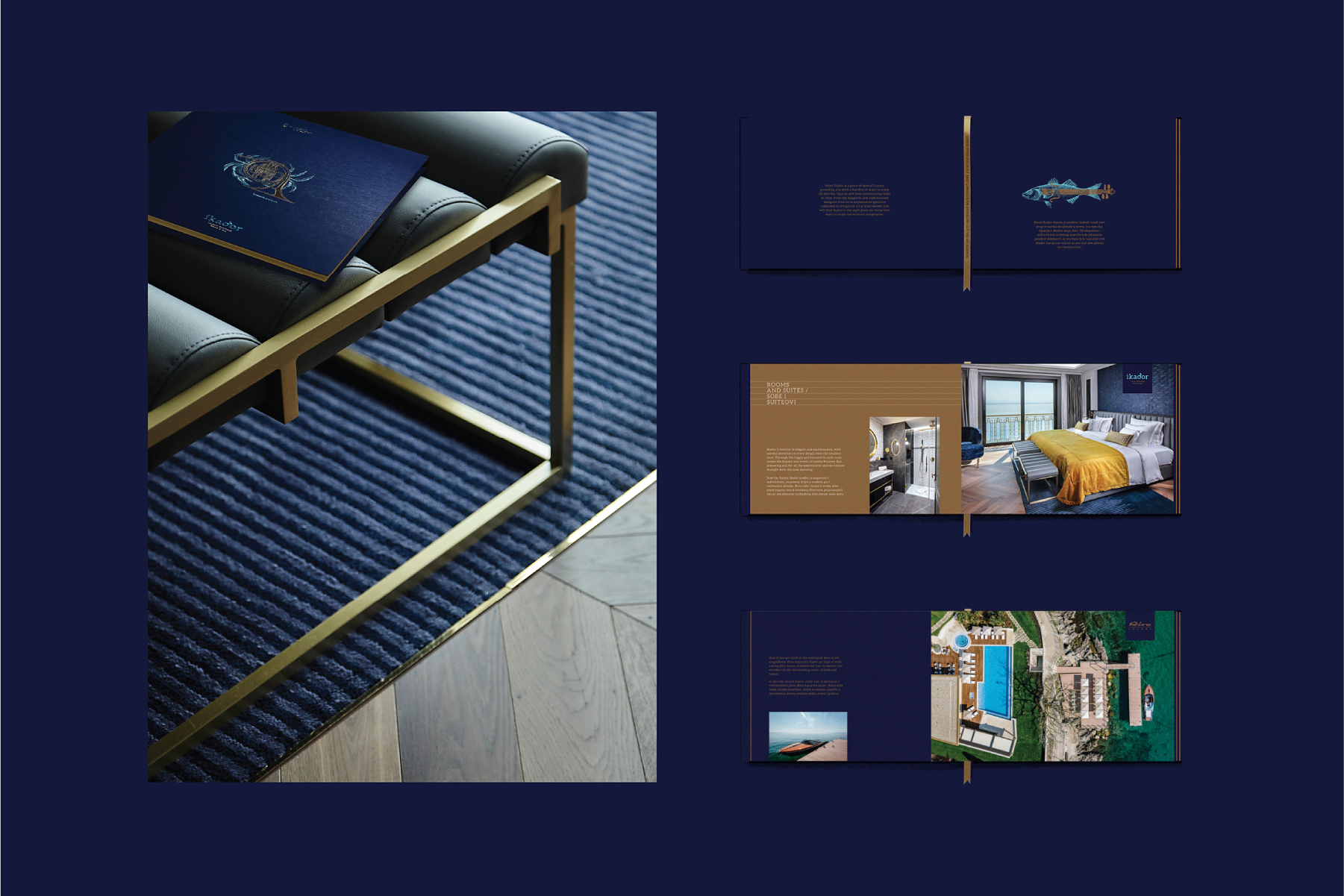 The visual identity was inspired by the very meaning of the word Ikador.The minimalist design of the logo is enhanced by the letter “d”, which has been converted into a musical note. The illustrations dominating the visual identity are inspired by composers, as well as a sea motif due to the hotel being located on the sea. The artist created impressive illustrations highlighting anunusual combination of both motifs: fish-violin, sea-horse-saxophone, lobster-piano and horn-rays. Just as composers often use everyday objects as musical instruments, producing interesting sounds and tones, the intention of the brand logo was to achieve a harmonious combination of these unusual motifs, the sea and music. Blue and gold are used in the visual identity. Blue is associated with the color of the Kvarner Sea, while the gold is associated with the colorof musical instruments, while further stimulating the feeling of elegance and luxury.