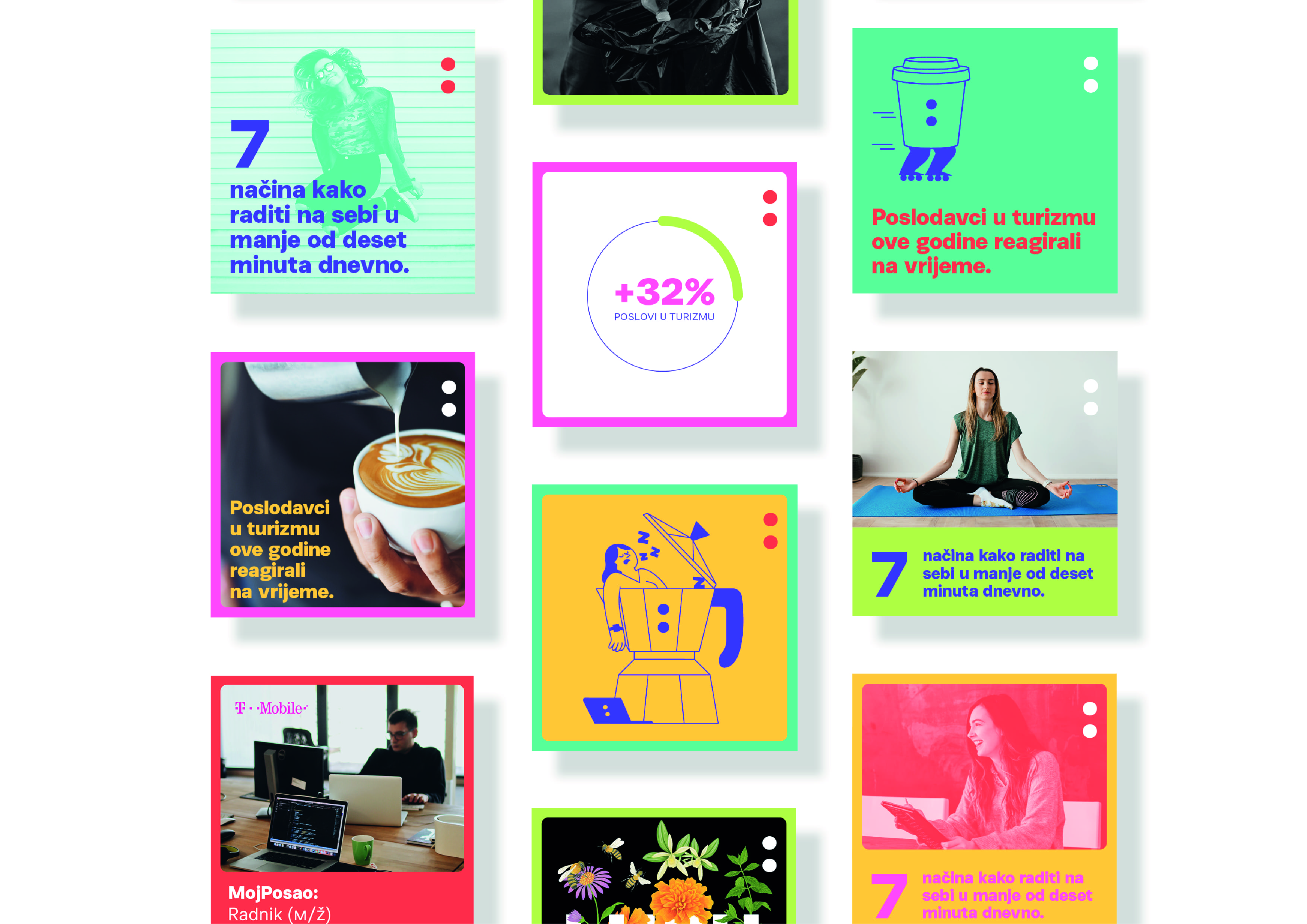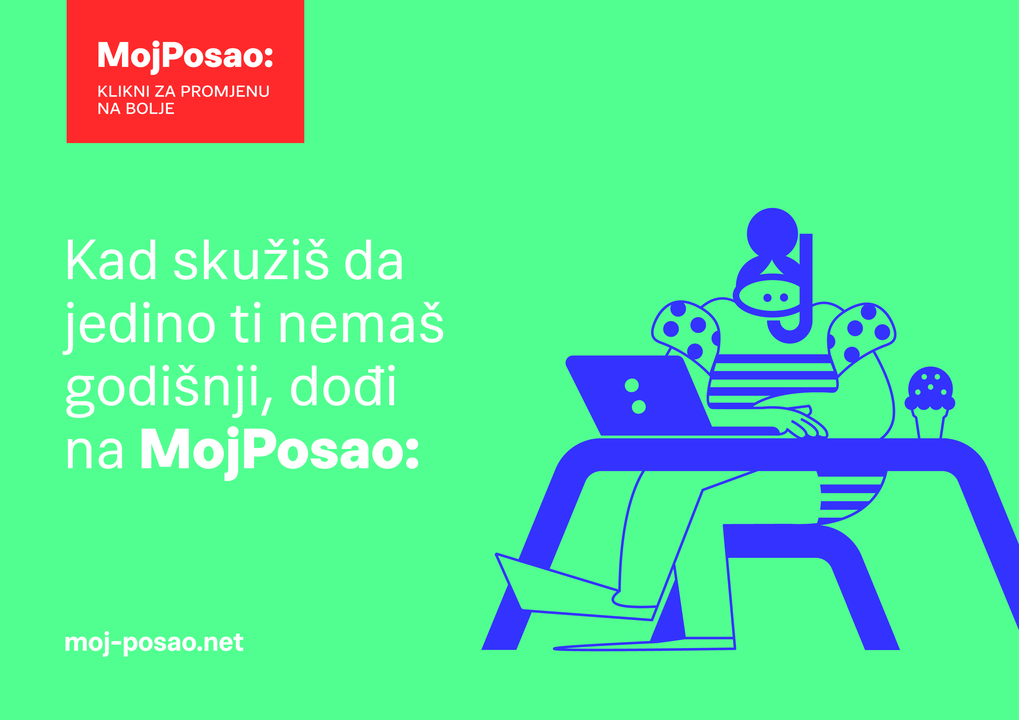 Our complete national campaign represents the rebranding. The core of the campaign is a series of original messages and illustrations that intriguingly invite candidates to change jobs.The common denominator of each message is “Come to MojPosao”, and each message has an imaginative and playful way to describe the situations in which many candidates have found themselves: “Come to MojPosao when your job is unbearably boring.”, “Come to MojPosao when your job is awful” or “When you are the only one of all your friends who doesn’t have a job, come to MojPosao”.